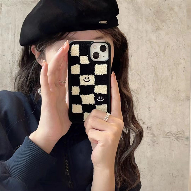 これからの季節にピッタリ!遊び心溢れるもこもこIphoneケースです。お洒落なダミエ柄&スマイリーフェイスパターンで癒されます。色違いでペアで持っても可愛い♪誕生日やクリスマスのプレゼントにおすすめです。